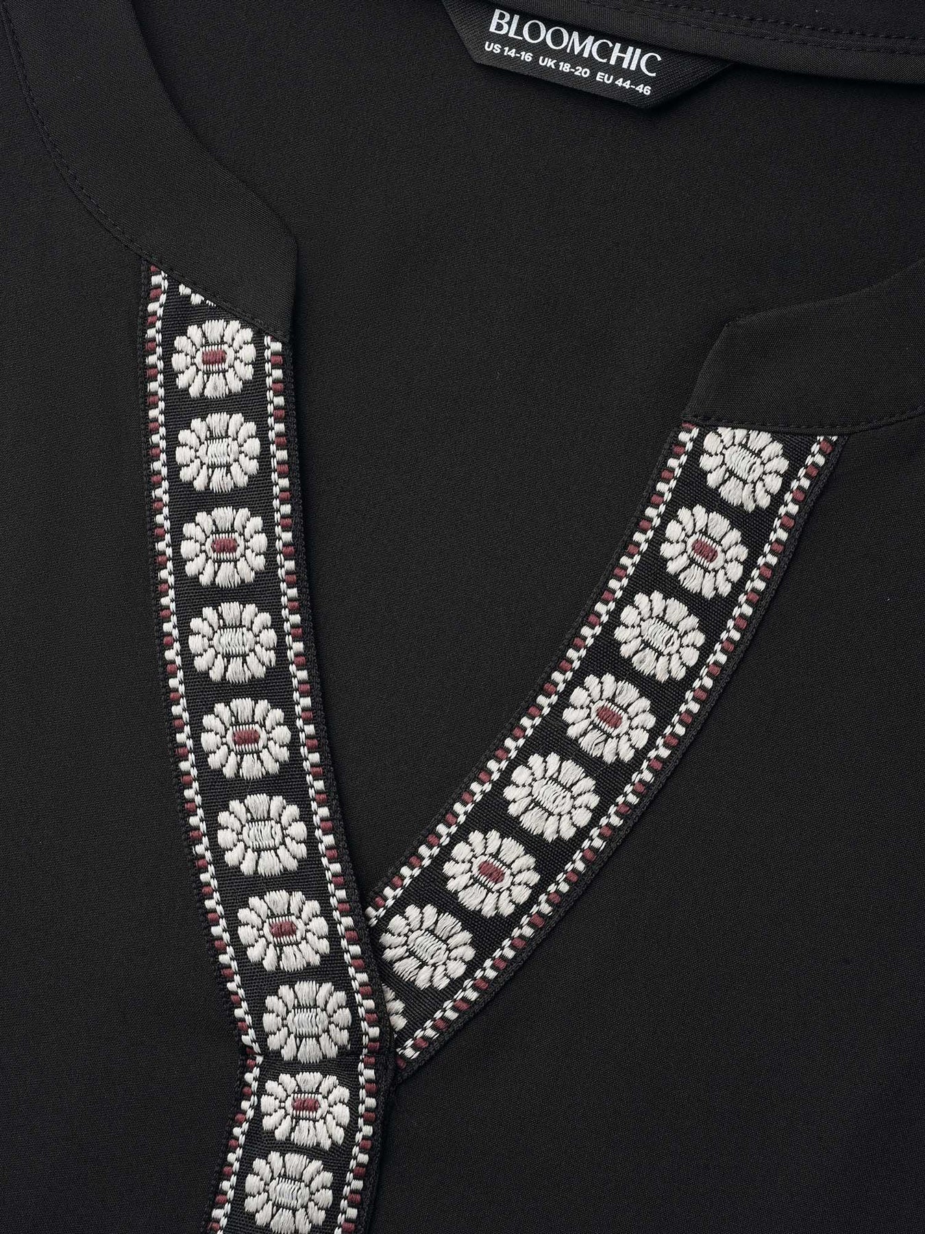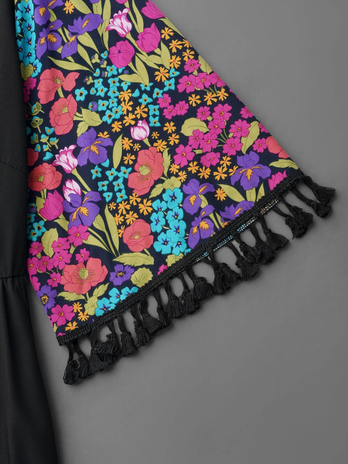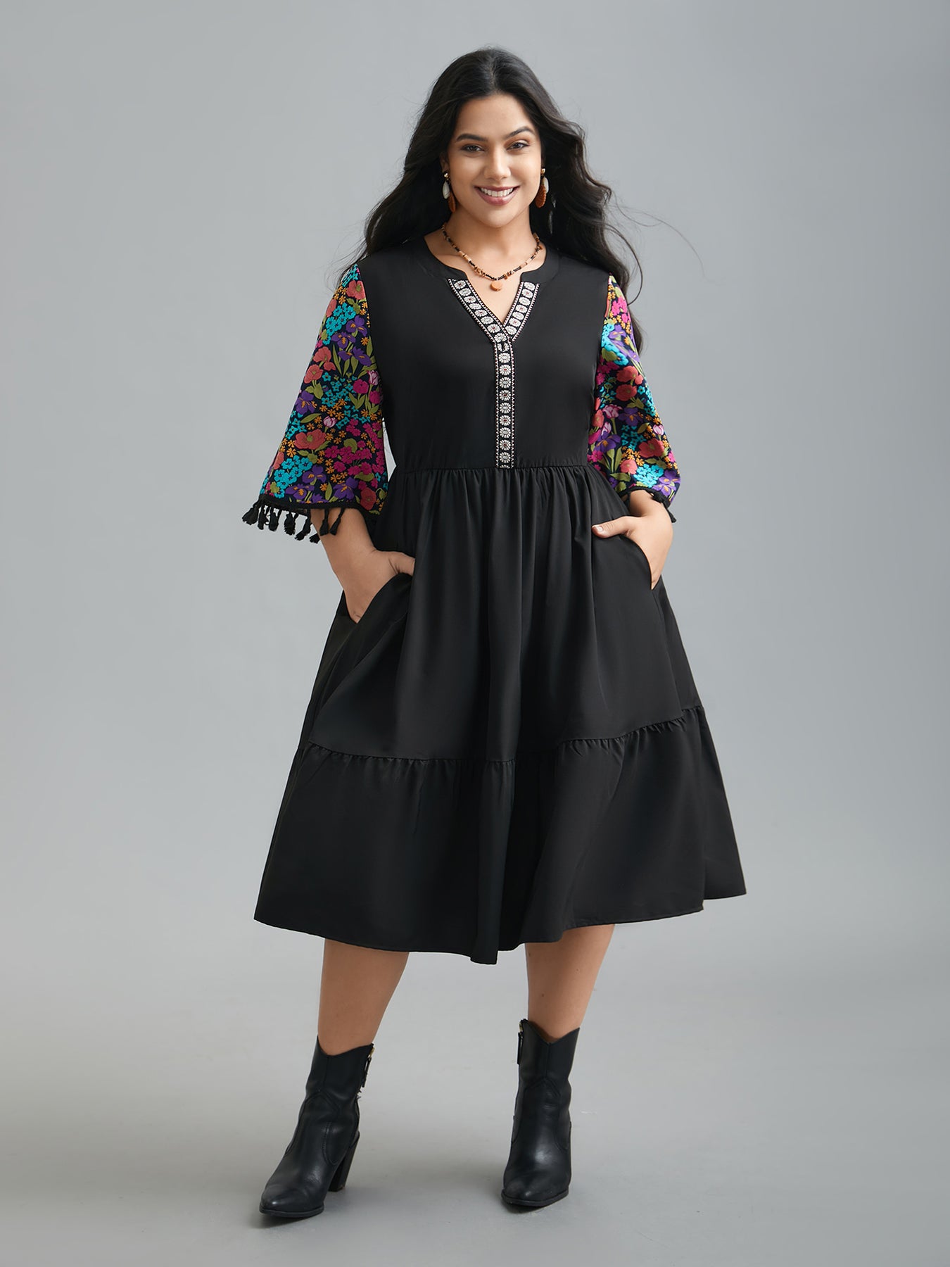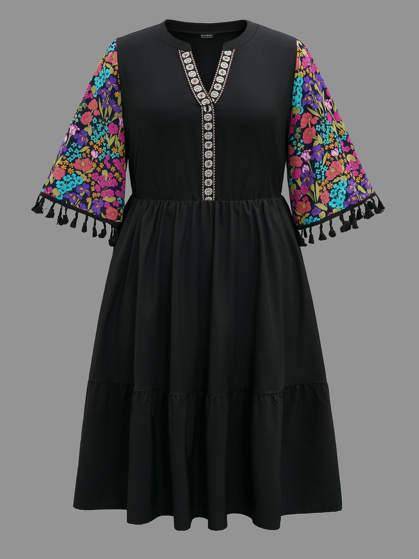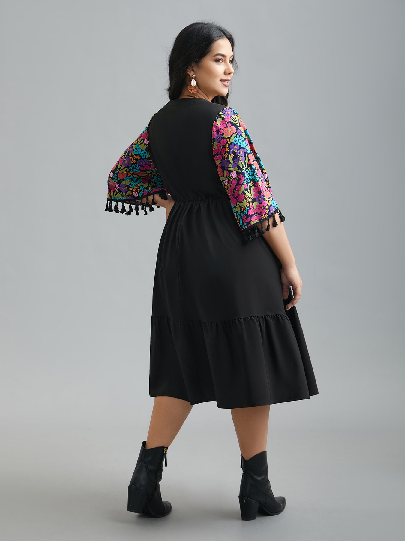Cotton Floral Embroidered Contrast Webbing Tassels Dress